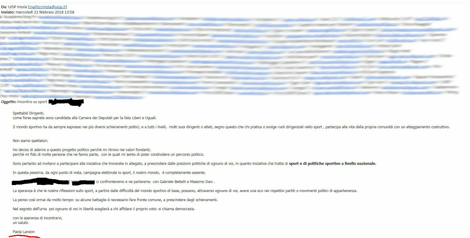 Il 21 febbraio la candidata di LEU Paola Lanzon ha inviato dalla mail imola@uisp.it, associazione dove è stata presidente fino a poco tempo fa, un’invito alle associazioni sportive imolesi a presenziare ad un incontro del suo (attuale) gruppo politico.