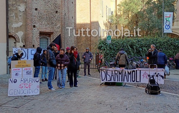 Imola, manifestazione “contro il riarmo e il commercio di armi”: volantini, appelli al boicottaggio e striscioni