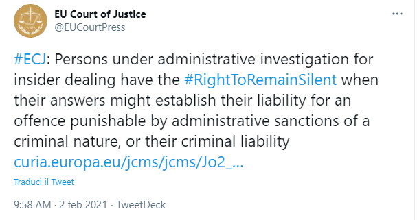 “Una persona fisica sottoposta ad un procedimento sanzionatorio amministrativo per abuso di informazioni privilegiate ha il diritto...