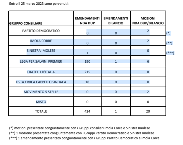 I gruppi consiliari hanno presentato un totale di 425 emendamenti e 20 mozioni collegate al Bilancio, il partito Fratelli d’Italia ha presentato il maggior numero di emendamenti NDA (Nota di Aggiornamento) DUP (Documento Unico di Programmazione) che sono proposte di modifica ai documenti programmatici e di bilancio di un’ente pubblico, come ad esempio un comune, una provincia o una regione. Un dato significativo, che dimostra l’attenzione e l’impegno di questo partito nei confronti della gestione finanziaria della città di Imola.
