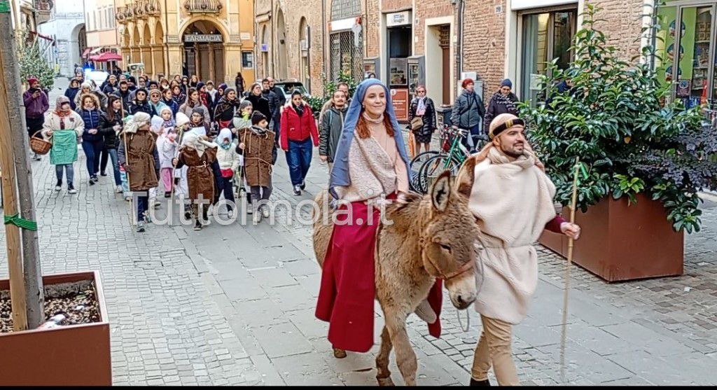 Oggi alcuni parrocchiani della Chiesa di Valverde, del Carmine e Sant’Agata con i propri bambini e una coppia con un asinello romagnolo (non più in pericolo di estinzione), accompagnanti dal parroco Don Daniele Sirna hanno rievocato per le strade di Imola il censimento di Maria e Giuseppe.